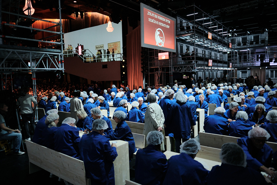 Das bedeutet aber auch: der szenografische Gestaltungsspielraum liegt nicht in der überraschenden Verwandlung von einem Stück ins nächste, sondern in der Raumnutzung selbst. Saß das Publikum bei Don Giovanni in einer Art immersiven Kirchenschiffsituation auf der Bühne und im Zuschauerraum, wurde bei Hamletmaschine aus dem (nur in diesem Block eingebauten) Steg durch das Parkett der durchgehend szenografisch gestaltete Gang inklusive Rampe auf die Hinterbühne und so der Clou des Konzepts. Die Bühnenbildner*innen der Stücke mussten sich dafür miteinander ins Benehmen setzen und gemeinsame Grundentscheidungen treffen, die dann für beide Stücke galten. Aus einem Spielplan unterschiedlicher Stück-Monolithen wird eine übergreifende szenografische Identität, ähnlich einem unausgesprochenen Spielzeitmotto. Ein Bühnenbild im Bühnenbild bedeutet aber auch, dass wir die künstlerische und technische Planung der Raumbühne nicht mit einem*r Gastbühnenbildner*in abgedeckt haben, sondern kontinuierlich mit Sebastian Hannak als Hausszenografen zusammenarbeiten, der als solcher nicht nur für die gesamte Raumbühne verantwortlich zeichnet und darin eigene Ausstattungen realisiert, sondern allen Gast-Teams als permanenter Ansprechpartner zur Verfügung steht.