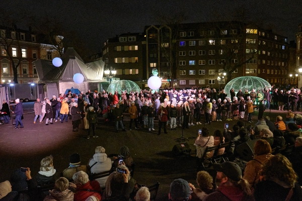 Viele von ihnen haben in den vergangenen Wochen die Proben auf dem Dell-Platz aufmerksam verfolgt: auf ihrem täglichen Weg zur Arbeit oder zum Einkaufen, beim Spielen mit ihren Kindern auf dem kleinen Spielplatz oder auch aus dem Fenster ihrer Wohnungen. Über 200 Sänger*innen im Alter zwischen 8 und 80 Jahren aus verschiedenen Duisburger Schul- und Stadtchören haben sich, unterstützt von professionellen Musiker*innen,2 mit dem Schubertschen Liederzyklus beschäftigt. Entstanden sind dabei überwiegend neue Kompositionen und Liedtexte, die die Lebensrealität und das Lebensgefühl der Beteiligten widerspiegeln. Durch das szenische Arrangement3 der einzelnen Lieder gewinnen sie eine besondere Intensität. Man spürt, dass den Beteiligten die Teilnahme an diesem Stadtprojekt etwas bedeutet und sie dem Publikum etwas von der Freude an dieser altersübergreifenden Gemeinschaftsarbeit vermitteln wollen. Ihre Begeisterung und Konzentration überträgt sich auf das Publikum, das vereinzelt leise vor sich hin summt und bei Schuberts Lindenbaum („Am Brunnen vor dem Tore“) zum Mitsingen eingeladen ist.